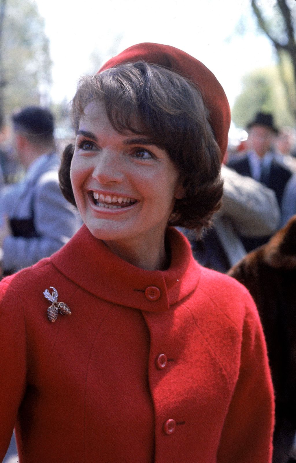 First Lady Jackie Kennedy, in red wool suit and beret designed by Oleg Cassini, on a trip to Canada in 1961.